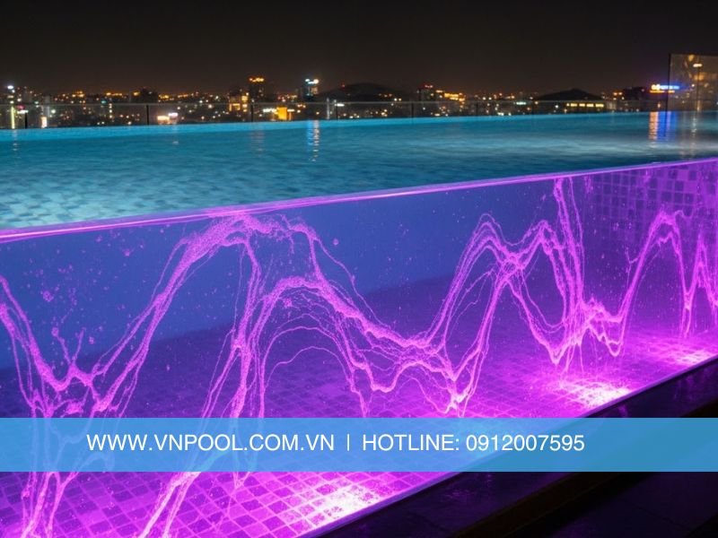 Điểm nhấn của dự án là bể bơi vô cực sử dụng kính cường lực cao cấp, kết hợp hiệu ứng “zero edge” tạo cảm giác mặt nước hòa quyện với đường chân trời đại dương. Đây là một trong những hạng mục thi công phức tạp, đòi hỏi sự chính xác cao về kỹ thuật kết cấu, thủy lực và xử lý môi trường nước biển.
